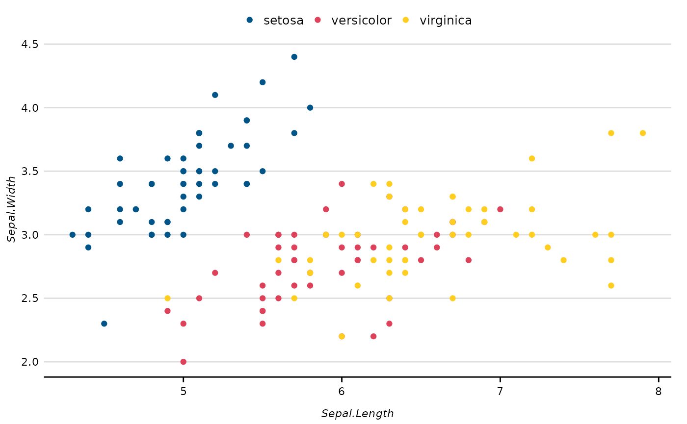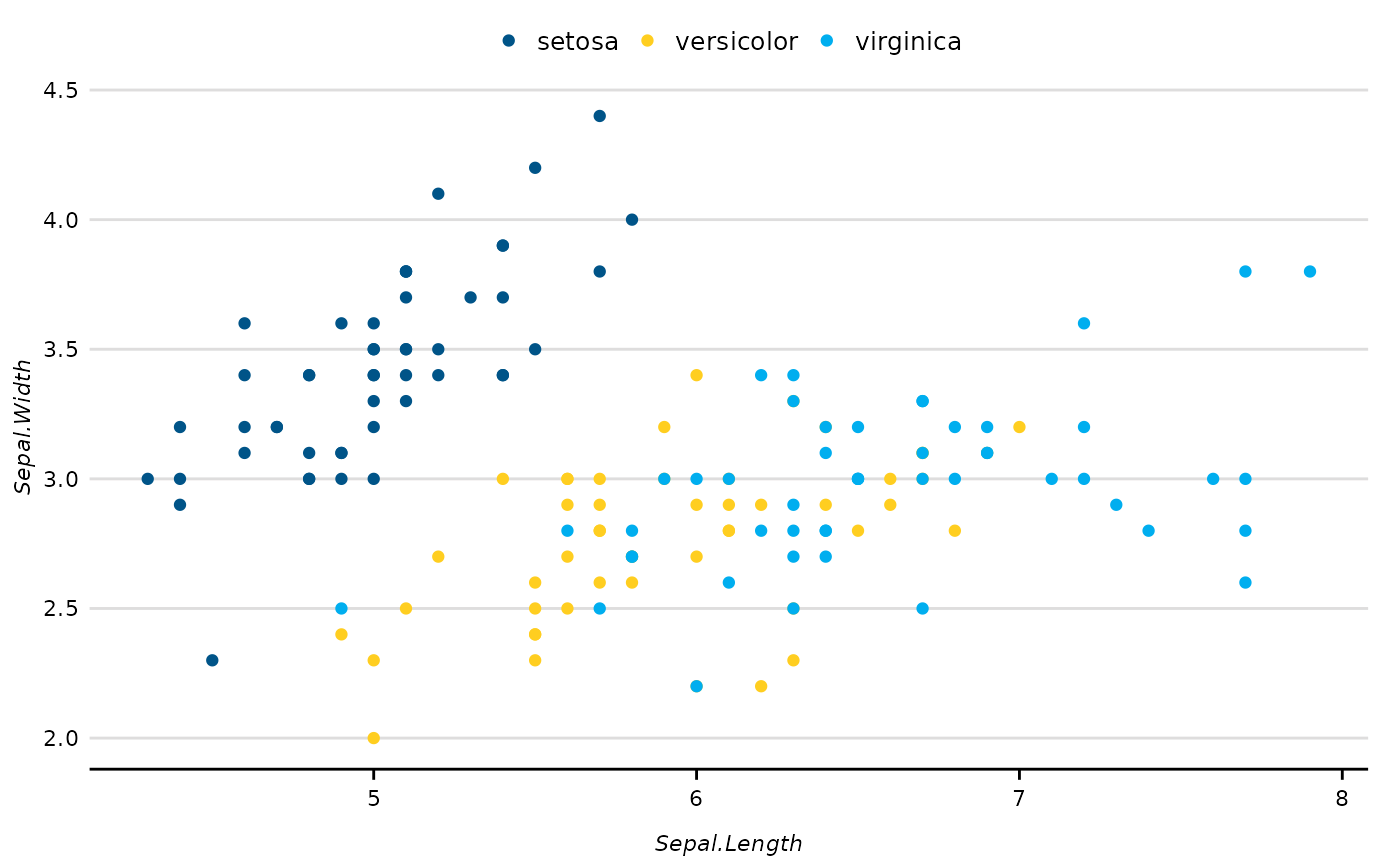 ggplot(iris, aes(x = Sepal.Length, y = Sepal.Width, color = Species)) +