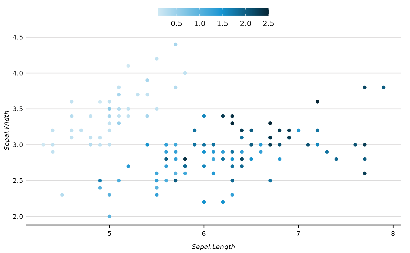 ggplot(iris, aes(x = Sepal.Length, y = Sepal.Width, color = Petal.Width)) +