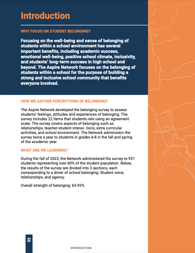 The Aspire Network developed the belonging survey to assess students’ feelings, attitudes and experiences of belonging. The survey includes 22 items that students rate using an agreement scale. The survey covers aspects of belonging such as relationships, teacher-student interac- tions, extra curricular activities, and school environment. The Network administers the survey twice a year to students in grades 6-8 in the fall and spring of the academic year.